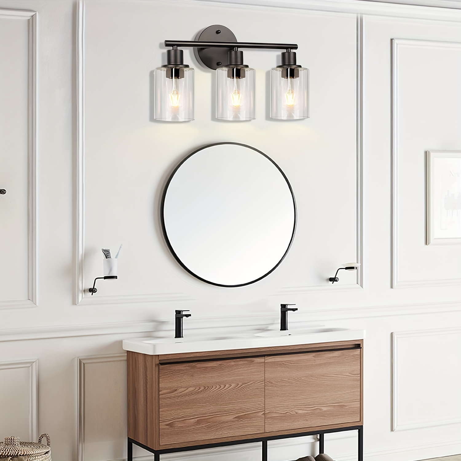 Elegant Design: The lighting fixture for the bathroom vanity is constructed from durable metal, offering moisture resistance and rust protection, featuring an E26 base for decoration, with a vintage and attractive look; The transparent glass shades safeguard the bulbs while presenting a contemporary style.