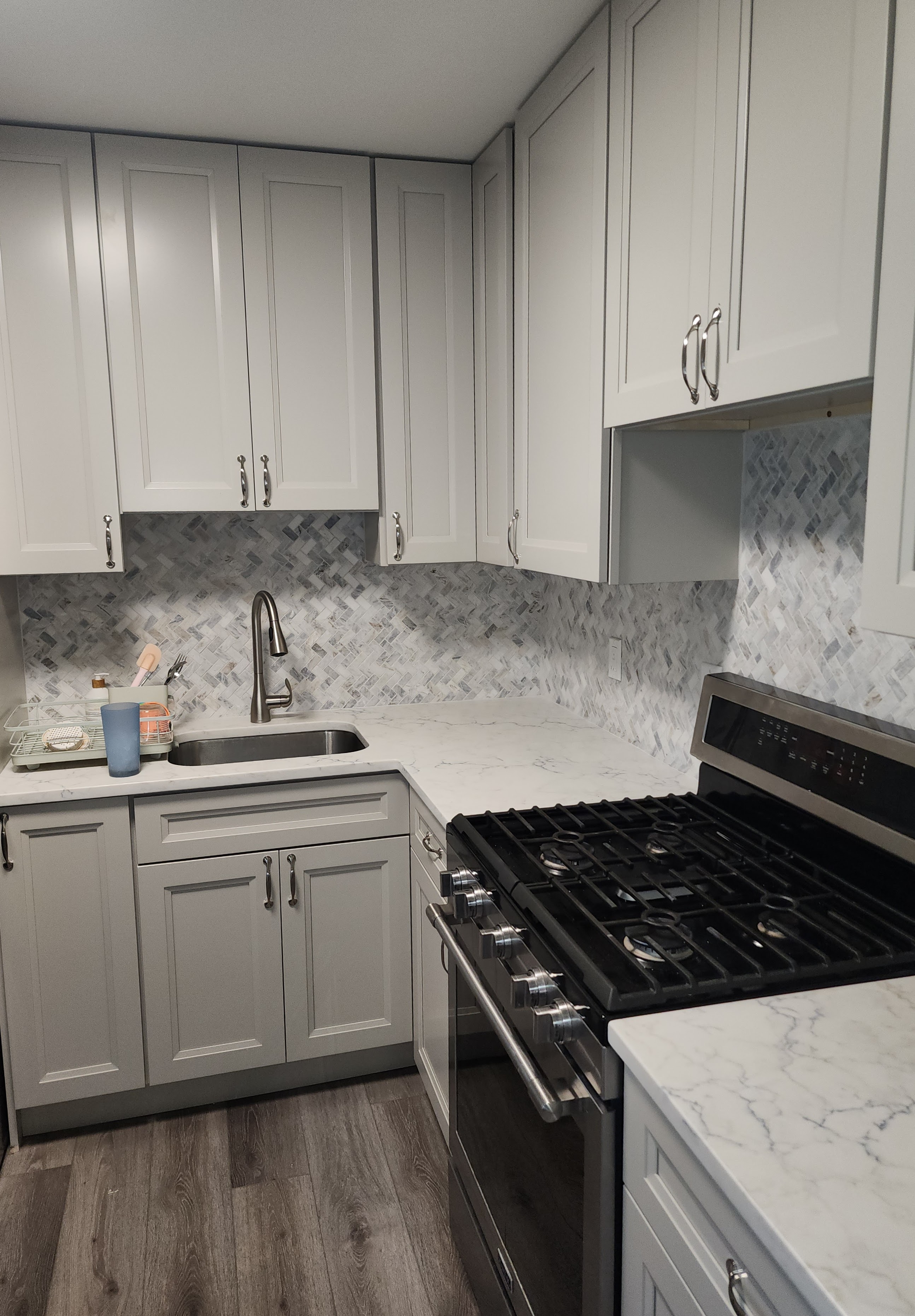 We installed solid wood cabinets with plywood construction, dovetailed joints, and soft-close doors and drawers—built to last a lifetime. Topping them off, we added a premium quartz countertop and a stunning marble herringbone backsplash for a timeless, elegant touch.